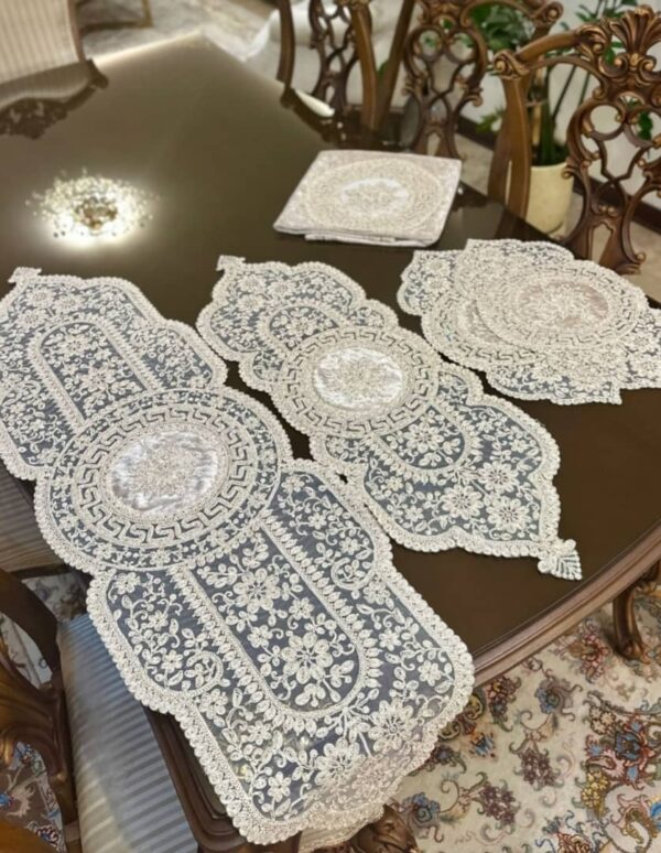 ست رومیزی 4 تیکه دانتل تور ورساچه ، ترکیبی بینظیر از طراحی لوکس و عملکرد روزمره است. این مجموعه شامل 2 عسلی 55×30 سانتیمتر ، جلو مبلی 90×30 سانتیمتر ، و رانر 145×40 سانتیمتر طراحی شده که با جزئیات تور ظریف ورساچه ، هر فضایی را به یک استایل مدرن تبدیل میکند.
